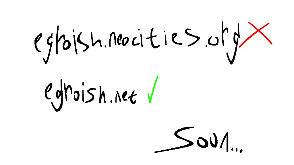 Hello there! I have REALLY big news! soon, Egroish's Website will be self hosted by ME! YES! and it will have egroish.net domain!! I didn't buyed the domain YET. So yeah, this website will transfer from neocities to egroish.net. STAY TUNED!!! (update: domain egrosh.net is now in my hands. transition will begain soon.)